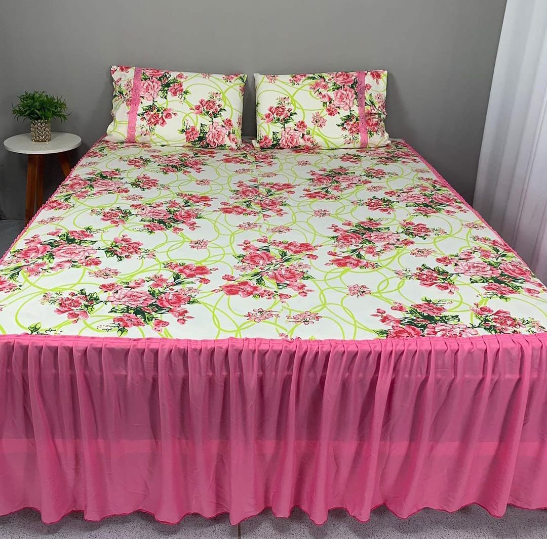 COLCHA BABADO HELANCA, KING, FLORAL, ROSA E BRANCO