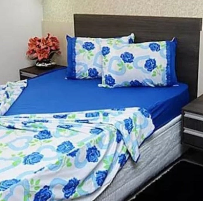 1 lençol sem elástico, 1 lençol com elástico, 2 fronhas
